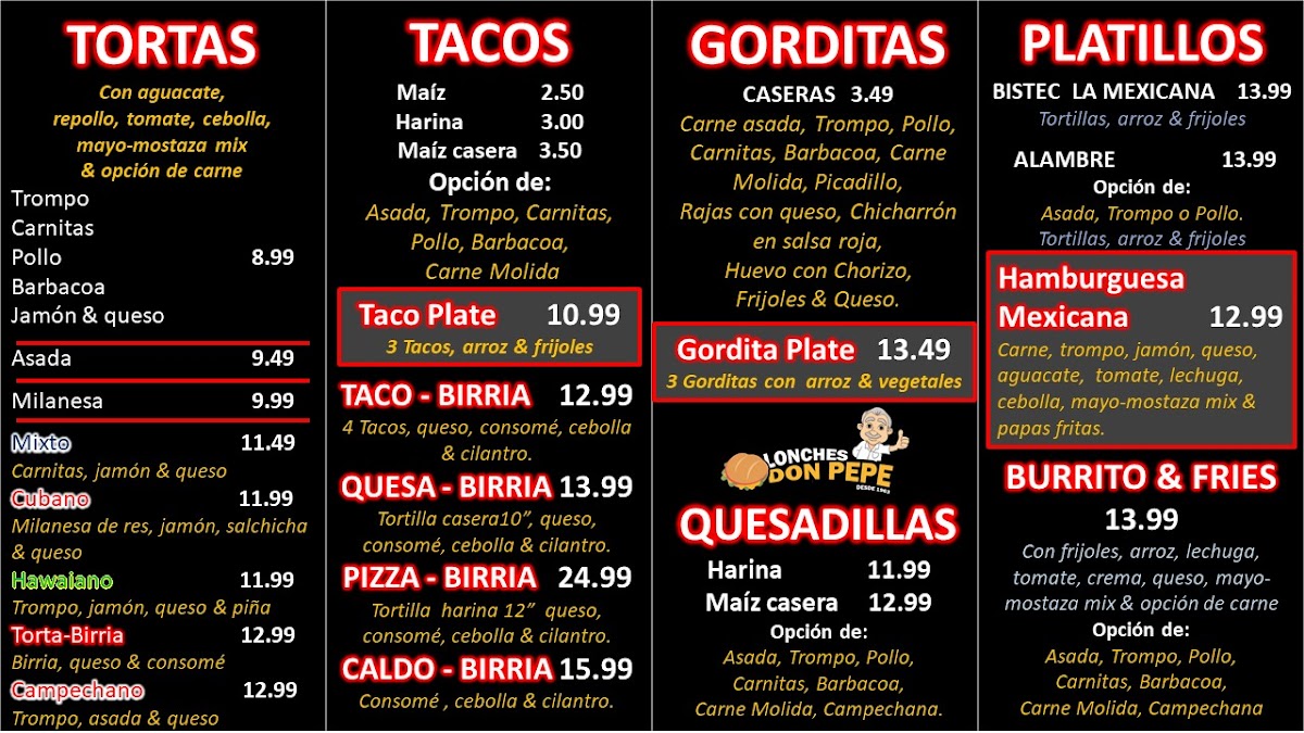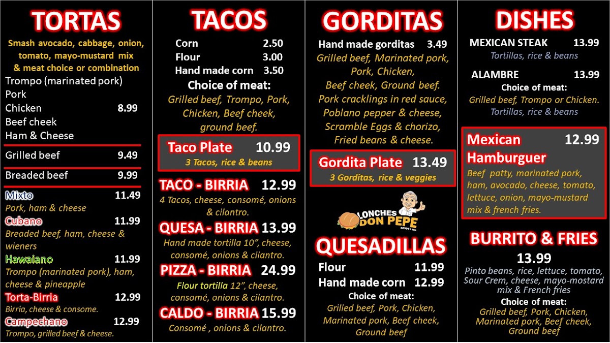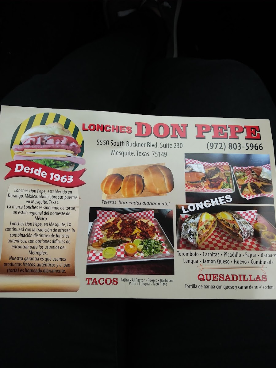 Welcome to LONCHES DON PEPE, a culinary gem nestled in Mesquite, Texas. This delightful eatery specializes in authentic Mexican cuisine, featuring an enticing menu filled with savory options. Diners can indulge in an array of mouthwatering dishes, such as their famed Birria Tacos, which showcase tender, slow-cooked meat enveloped in handmade tortillas. If you’re feeling adventurous, don't miss the Torta Birria or Quesa Birria, both bursting with rich flavors.