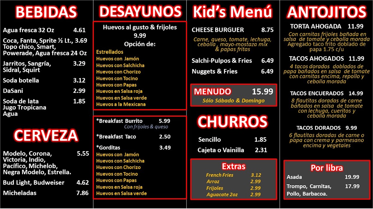 - Libra De Carne: Chunks of Asada, Pollo, Barbacoa, and more await at affordable prices.